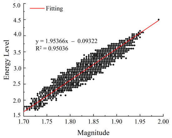 We performed a regression analysis on the fracture intensities of all samples based on the relationships between AE energy and amplitude of sandstone [27] as well as their fracture energy level and magnitude. As shown in Figure 6, the averaged correlation coefficient was 0.95.