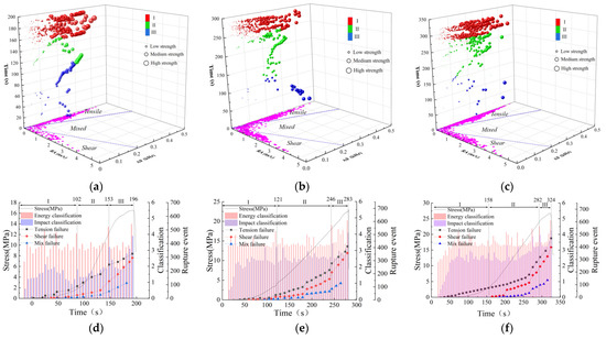 In stage (I), the fracture was dominated by high-AF and low-RA tensile fractures, as well as a few fractures with low intensity, low energy level, and low impact level. In stage (II), the proportion of tensile fractures decreased, and the number of shear fractures increased, and the fracture type changed from tensile to shear. Here, the number of fractures gradually increased initially, the intensity grade gradually changed from low intensity to medium intensity, the impact rate grade exhibited multiple peaks, the energy level tended to be stable, and the coal mass micro-fracture frequently occurred. In stage (III), fracture quantity and intensity increased considerably, especially medium and high intensities, and the impact rate substantially increased. The results of RA–AF and failure mode analyses showed that the fracture incidents were mainly of the shear type, increased exponentially, and were accompanied by abnormal shear fractures with high RA and low AF, which indicated sample failure.