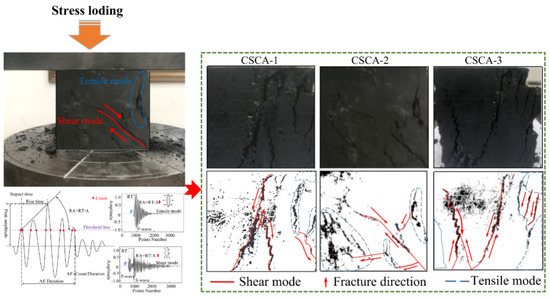 Figure 8 shows the fracture evolution characteristics and fracture mode of a coal mass sample at stage (III). In the loading process of CSCA-1 at the center of the oil and gas enriching section, shear failure first occurred along two principal fractures, and then tensile failure occurred at the edge of the sample. However, fractures were not propagated throughout the sample. Stress and energy continuously accumulated, and finally, shear fracture was propagated throughout the sample in the middle of the principal fracture induced by shear stress. Further, energy was rapidly released during this process. The phenomena that occurred were as follows: A large principal fracture occurred in the sample because of high-pressure oil and gas diffusion at the early stage; moreover, shear failure occurred in the sample along the principal fracture direction under the action of external loads. In the loading process of sample CSCA-2 in the center of the oil–gas enriching section, the sample was first dominated by tensile failure, then the fracture expanded, extended, coalesced, and formed a network structure from the edge to the middle. Subsequently, shear failure occurred in the middle of the sample. The failure path of the sample was approximately a conjugate failure path. In the fracture of sample CSCA-3 at the edge of the oil–gas enriching section, the number and failure form of the fracture expansion were relatively complex. Tensile failure first occurred at the edge of the sample. As the loading strength increased, the fracture expanded, coalesced, and formed a network. Finally, under the combined action of tensile and shear failures, the sample collapsed, and the accumulated stress energy was rapidly released. Moreover, the sample had a high residual strength after yield strength.