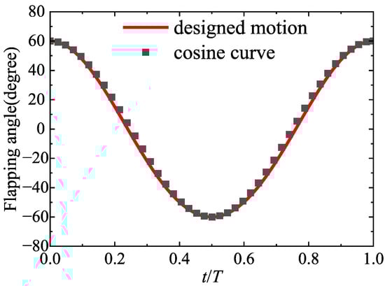 The LEs are made of carbon-fiber-reinforced polymer (CFRP) rods of 1.5 mm and were rigidly installed to the pinion gears to output the flapping motion. Therefore, the output flapping angle tends to be a cosine curve, approximately, as referred to in Figure 2, which represents the designed flapping angle in one flapping cycle.