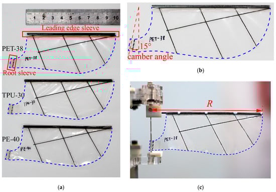 Wings designed for the test. (a) Photograph of three wings; (b) Description of the camber angle; (c) Wing assembled on the mechanism.