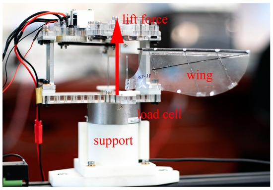A series of tests were conducted for these three wings under various flapping frequencies. Figure 4 presents the measurement setup. The lift force was defined as the vertical force generated by the flapping wing. During the force measurement, the flapping wing mechanism was connected to a six-axis force/torque sensor (Mini40, ATI Industrial Automation Inc., Apex, NC, USA), which was attached to the support. The force resolution of this load cell is 1/50 N. An in-house LabView program was used to record the force and torque data through a data-acquisition board (National Instruments, Austin, TX, USA), with a sampling rate of 2000 Hz. The program was designed to record the force data within the next 1 s after each trigger, and at least 10 flapping cycles’ data were recorded according to the flapping frequency set in this research. Subsequently, more than 20 force measurements have been conducted during the stable flapping process at each flapping frequency. Meanwhile, the fifth-order low-pass Butterworth filter was adopted to filter the force data. The cut-off frequency is three times the flapping frequency, which has been proven to be effective in filtering high-frequency vibrations of the mechanisms while retaining reliable force data [25].