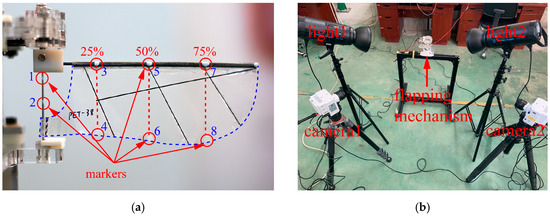 The rotation angles of three different wing sections (25%, 50%, and 75% of the wingspan) are measured to obtain the wing’s deformation. As shown in Figure 5a, the white-colored markers with a diameter of about 2 mm are placed at the leading edge and corresponding trailing edge. The flapping process is filmed with two synchronized high-speed cameras (Phantom VEO-E 340L) with a resolution of 1280 × 960 pixels at 2000 fps. As presented in Figure 5b, the cameras are arranged approximately orthogonally to clearly capture the marked points. The position of the markers was tracked manually in each frame using the open-source digitizing tool, DLTdv8, developed by Hedrick [26], and based on the direct linear transformation method. Meanwhile, two additional markers were placed on the steel bar fixed at the wing root, which were tracked as a reference to calculate the rotation angle.