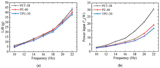 As shown in Figure 7b, similar trends in the three power input curves can also be observed, which increase with the increase of flapping frequency. At a higher flapping frequency, the power input grows rapidly, implying a greater power required at a higher frequency. More precisely, the relationship of power input against flapping frequency also seems nonlinear. This phenomenon can also be found from the research by Nan et al. [17], who conclude the power consumption scaled with approximately a third of the power of the frequency. Similar to the result of lift, the input power of PET-38 is the largest of all flapping frequencies, while that of TPU-30 is the smallest. The higher the frequency, the greater the difference in power consumption of the three wings. At 22 Hz, the power consumed by the PET-38 is almost twice as much as that consumed by the TPU-30.