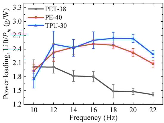Power loading, defined as the lift generated by per unit power (Lift/Pin), can be considered as the efficiency of power input conversion into lift generation, and is shown in Figure 8. The calculation of the standard deviation for the power loading follows the error propagation criterion [28]. Of note, different from the result of the lift and power input, the power loading curves of the three wings present an inconsistent trend. With the increase of the flapping frequency, the power loading of PET-38 decreases monotonously, and the maximum value appears at 10 Hz. The power loading of PE-40 increases first to the peak value at 16 Hz, after which it drops gradually. The power loading of TPU-30 gradually increases and then decreases, and the maximum value is obtained at 20 Hz. In other words, each wing has an optimum flapping frequency to obtain maximum efficiency, which is consistent with the research by Godoy-Diana and Thiria [12]. It can be found that the power loading of TPU-38 is the largest among most flapping frequencies, while that of PET-38 is the smallest, although this wing has the best lift performance.