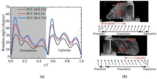Wing deformation of PET-38 at 14 Hz. (a) The rotation angles of PET-38 measured at three wing sections. The gray zone indicates that the wing is flapping downstroke; (b) Diagram of wing motion drawn based on the rotation angle at 0.5R; the black dot means the leading edge.