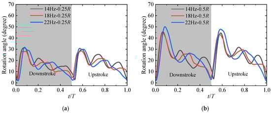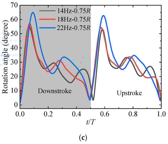 Wing deformation of PET-38 at 14 Hz, 18 Hz, and 22 Hz. (a) The rotation angles at 0.25R; (b) The rotation angles at 0.5R; (c) The rotation angles at 0.75R.