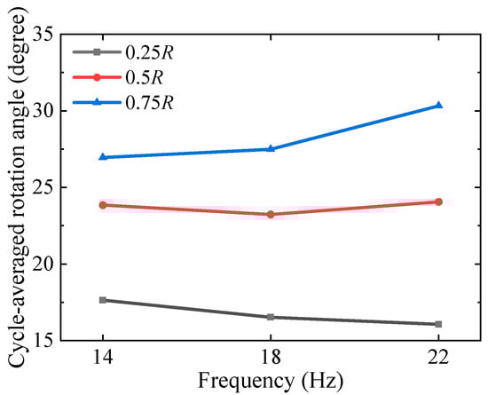 The effect of flapping frequency on the wing deformation can also be seen from the cycle-averaged rotation angle presented in Figure 11. The cycle-averaged rotation angle was calculated by averaging the rotation angle over a flapping period, and can be defined as: