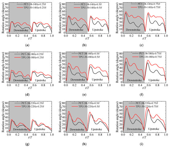 The rotation angles of PET-38 and TPU-30 are presented in Figure 12. It can be found that at almost all flapping frequencies, more flexible TPU-30 shows a larger rotation angle than PET-38. Furthermore, the amplitude of angle fluctuation seems smaller for the TPU-30, suggesting that flexibility plays a dissipative role in the angle fluctuation. As referred to in Figure 8, TPU-30, with slighter angle fluctuation, obtained higher power loading, suggesting that eliminating the fluctuation is beneficial for improving efficiency, which is consistent with the research of Lee et al. [21].