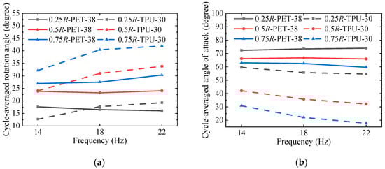Cycle-averaged angle comparison of PET-38 and TPU-30. (a) Cycle-averaged rotation angle; (b) Cycle-averaged angle of attack.