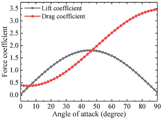 It can be seen from Figure 13b that PET-38 has a larger cycle-averaged angle of attack, which is close to 65 degrees, whereas the angle of attack of TPU-30 ranges from 20 degrees to 60 degrees. As presented in the study by Dickinson et al. [1], the optimal translation component of lift can be obtained at an angle of attack of 45 degrees, based on the quasi-steady aerodynamic model, as seen in Figure 14. Under this circumstance, the lift of TPU-30 should be larger than that of PET-38 at a certain flapping frequency, since the angle of attack of TPU-30 is closer to 45 degrees, as seen in Figure 13. However, by looking at Figure 7a, PET-38 with a larger angle of attack obtained a higher lift. This contradiction implies that there is another noticeable lift component that contributes to the resultant force apart from the translation lift.