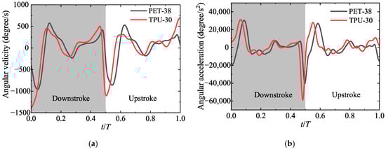 Although the trend of angular velocity and angular acceleration curves of PET-38 and TPU-30 are similar, there are still differences in values, especially during the stroke reversal. At this phase, PET-38 obtained a larger positive angular velocity and angular acceleration than TPU-30, thus PET-38 might have a larger rotating force and additional mass force, which will eventually lead to a higher total lift. Additionally, as seen in Figure 14, a larger angle of attack of PET-38 will lead to a higher drag force, which is defined in the stroke plane and opposite to the flapping direction. Higher drag force will contribute to more energy consumption, corresponding to a higher power input for PET-38, as referred to in b.