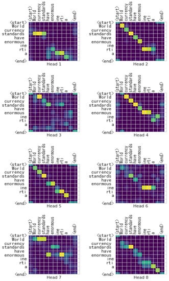 We randomly selected a sentence (“World currency standards have enormous inertia”) from the WMT 2014 English–German corpus to show the heat maps.