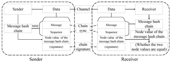 The last node of each message hash chain is called the tail node, and the other nodes are called the intermediate nodes. The sender updates the node of the message hash chain corresponding to the latest sequentially sent message to a tail node and updates the original tail node to an intermediate node. The receiver verifies the messages in sequence and uses the successfully verified messages to construct a node of the message hash chain. Update this newly constructed node to the tail and the previous tail node to the intermediate nodes.