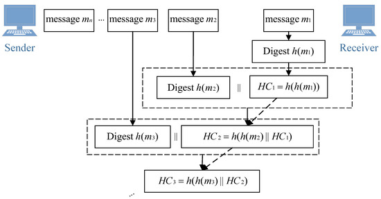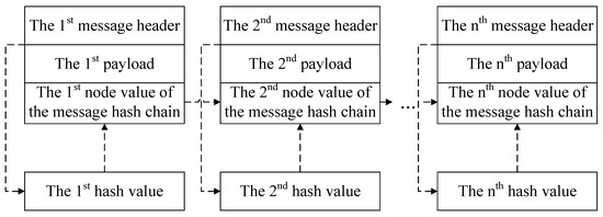 The construction method of the message hash chain is shown in Figure 3. The communication node needs to calculate the first node value of the message hash chain according to the first message , obtained by performing two hash function calculations on . After that, each message needs to calculate a digest using a hash function and then splice this digest with the tail node of the message hash chain to calculate the corresponding node value of the chain.