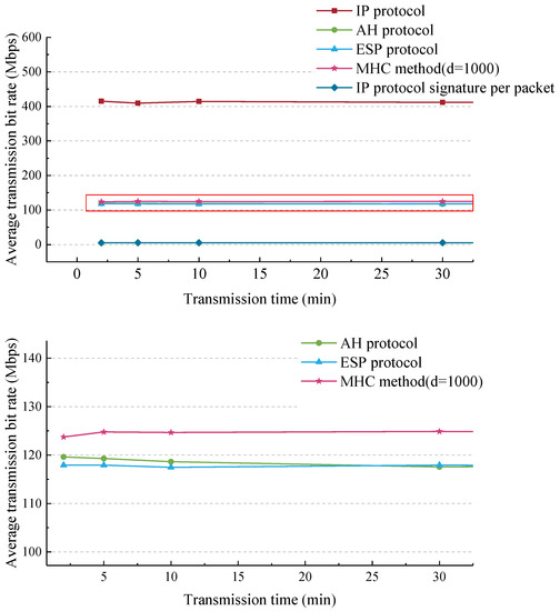 The SA established by the AH protocol needs to set the life cycle and renegotiate and update the SA policy parameters before the end of the cycle. The shorter the life cycle, the higher the security of the parameters, but the negotiation process will affect the transmission efficiency. It can be seen from the test results shown in Table 4 that, under the above experimental conditions, the time used to transmit data of the same length in the MHC mode is shorter than that in the AH protocol communication mode. By calculating the average throughput of each test group, we found that the MHC method was more efficient than the AH protocol in each comparison group, and the larger the transmitted data, the more pronounced the gap. Specifically, taking the AH protocol communication method with a life cycle of 2 min as an example, when transmitting data with a length of 1G, the average throughput of the MHC method is 2.79% higher than the average throughput of the AH protocol, but when transmitting data with a length of 50G, this ratio increases to 5.77%.
