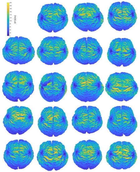 The efficacy of TMS interventions is based on multiple parameters that fall into three main categories, i.e., they are related to the coil, the stimulus, and the brain. The physical properties of the electromagnetic coil, i.e., its shape and dimensions [14], define the depth of stimulation and the volume of the stimulated area [3]. Generally, larger coils are used in order to cover more extensive targets [15], while smaller ones achieve higher focality [16]. The coil’s exact position over the scalp is particularly relevant for the outcome of stimulation [17], as the orientation of the coil relative to the underlying sulcus affects the induced EF distribution [18], with the vertical relative position being the optimal one, as it is reported that typical targets, such as the motor cortex, are most sensitive to vertically oriented electric fields. The stimulus characteristics, i.e., its magnitude, density, and duration, as well as the waveform of the magnetic pulse, also constitute critical parameters for the method’s efficiency [19], which is additionally affected by the geometry and electrical properties of the brain tissue [20]. However, due to the complexity of neurobiological phenomena and the diversity in human brain anatomy, the exact details of how TMS works remain vague [18]. One complementary approach that may provide valuable information about the mechanisms underlying TMS effects on the human brain is computational EF modeling [21,22]. Thus, it is increasingly used to enhance the method’s diagnostic potential and increase its therapeutic efficiency [23].