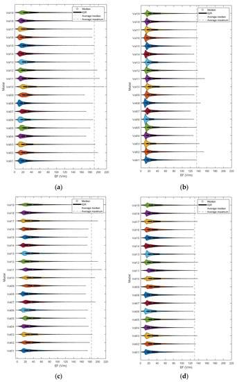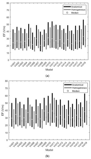 As graphically expressed in Figure 3, the inter-subject distributions vary distinctly for both coil positions, regardless of the model’s composition. Even for the homogeneous versions, the individual morphology is enough to create differences in the induced EFs among subjects, a fact that verifies the necessity of implementing personalized head models in TMS applications.