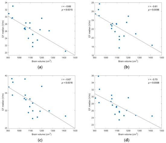 EF median showed statistically significant negative correlation to brain volume for each investigated scenario; (a) frontal coil position on anatomical models; (b) frontal coil position on homogeneous models; (c) central coil position on anatomical models; (d) central coil position on homogeneous models.