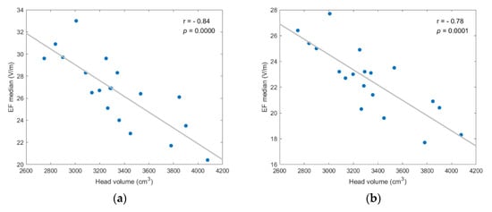 As shown in Figure 6, the negative correlation between median value and head volume was even stronger, with r ≤ −0.78 and p-value ≤ 0.0001 for every scenario. Additionally, similar results for the EF quartiles (Q1, Q3) support the assumption that head and brain sizes are critical anatomical parameters for the efficacy of TMS, since higher field intensities are induced in smaller volumes. (Figures regarding the quartiles’ correlation analysis are included in Appendix A).