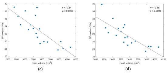 EF median showed strong, and statistically significant negative, correlation to head volume for each investigated scenario; (a) frontal coil position on anatomical models; (b) frontal coil position on homogeneous models; (c) central coil position on anatomical models; (d) central coil position on homogeneous models.
