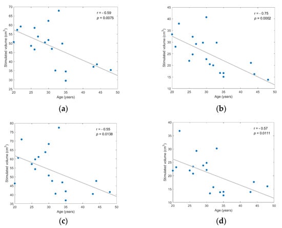Stimulated volume showed statistically significant negative correlation to age for each investigated scenario; (a) frontal coil position on anatomical models; (b) frontal coil position on homogeneous models; (c) central coil position on anatomical models; (d) central coil position on homogeneous models.