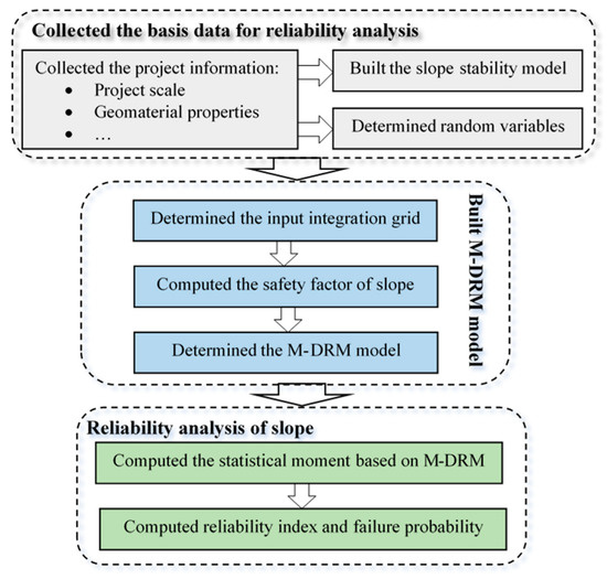 In this study, MDRM was adopted to represent the implicit, high-dimensional, and nonlinear relationship between random variables and safety factors of a slope to improve the efficiency. The statistics moment of safety factor was estimated based on MDRM. The mean and standard variation of the safety factor was computed based on the statistics moment. FOSM is used to determine the reliability index of the slope. To the practical slope engineering, the slope stability model was built based on numerical methods such as limit equilibrium theory, finite element method, discrete element method, etc. Then, the following contents was used to determine the moment of slope safety factor and compute the reliability index.