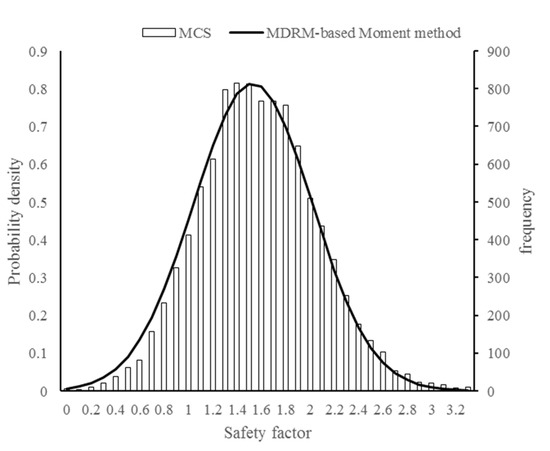 For most stability analysis methods for slopes, the factor of safety will be calculated using a numerical method and cannot be represented as an explicit function of the random variables. It is difficult to calculate the partial derivatives of the limit state function in slope reliability analysis. However, the partial derivatives are indispensable for the FOSM method in reliability analysis. To overcome the above difficulty, MDRM, which avoids determining the limit state function and their partial derivatives, was adopted to determine the moment of the slope safety factor. Once the first and second moment of the limit state function was determined, FOSM could be utilized to evaluate the slope reliability based on Equation (4) using MDRM.