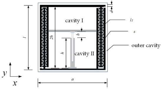 The cross section of the cell is shown in Figure 2 (x, y is the direction of periodic arrangement). As shown in the figure, the framework of the cell is a square structure; the inner cavity of the Helmholtz resonator is divided into two parts by a movable diaphragm. The smaller upper cavity is cavity Ⅰ, and the larger lower cavity is cavity Ⅱ. Cavity Ⅰ and cavity Ⅱ are connected to the outer cavity through a labyrinth tube. The design of the labyrinth tube makes full use of the folding and coiling of the space, which greatly increases the length of the tube, fully extends the propagation distance of sound waves in the structure and effectively reduces the lower limit of the low-frequency band gap. Moreover, the volume of the two cavities can be adjusted by changing the length of the telescopic screw, so as to change the structure configuration. This design can achieve the purpose of adjustable band gap and active control of low-frequency noise. The structural parameters are as follows: the length of the framework is l, the thickness of the wall and the diaphragm is d, the total height of the inner cavity is 2h, the height of the telescopic screw is h, the width of the labyrinth tube is s, the length of the labyrinth tube is l1, the length of the screw is b, the volume of cavity Ⅰ is V1, the volume of cavity Ⅱ is V2 and the lattice constant is a.
