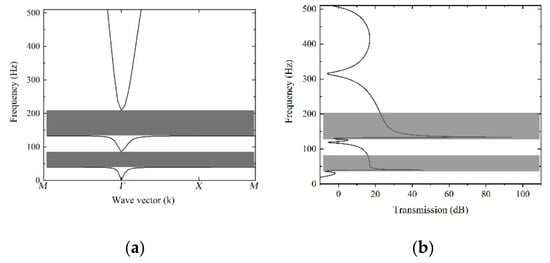 As shown in Figure 4a, the structure has two complete band gaps (the gray part in Figure 4a in the range of 0–500 Hz. Among them, the first low-frequency band gap ranges from 39.27 Hz to 86.18 Hz, and the second complete band gap ranges from 133.12 Hz to 209.44 Hz. In order to verify the correctness of the calculation of band structure, the transmission spectrum of the periodic structure was made for comparison. In COMSOL Multiphysics, Equation (6) was used to calculate the transmission loss of the sound waves in the range of 0~500 Hz in the periodic structure. As shown in Figure 4b, the suppression range is in good agreement with the band gap, which verifies the correctness of the band gap calculation.