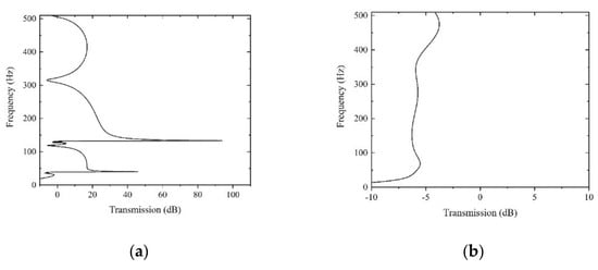 (a) Transmission spectrum of the phononic crystal; (b) transmission spectrum of the control group.