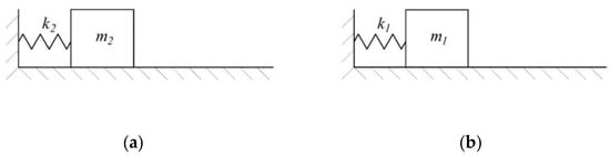 According to the sound pressure fields at each point, the vibration modes were analyzed, and the corresponding equivalent model was established. For point A and point C, it can be seen from the above analysis that the vibration modes of point A and point C are similar. As shown in Figure 7a, the sound pressure field of the outer cavity, cavity Ⅰ and the tube of cavity Ⅰ at point A is almost 0, so the effect of air in the outer cavity, cavity Ⅰ and the tube of cavity Ⅰ can be ignored. The two regions of cavity Ⅱ and the tube of cavity Ⅱ are considered. According to the principle of mechanical-acoustic analogy, the long and narrow labyrinth tube can be equivalent to an oscillator, while the air in the cavity Ⅱ can be equivalent to an air spring. The established “spring-oscillator” model of point A is shown in Figure 8a. Similarly, as shown in Figure 7c, the sound pressure field of the outer cavity, cavity Ⅱ and the tube of cavity Ⅱ at point C is 0, so these parts of air can be ignored. Therefore, the spring-oscillator model of point C is shown in Figure 8b.