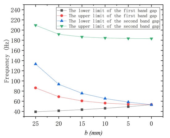 In order to further explore the adaptation range of this structure, the influence of the change of the inner cavity structure on the band structure was analyzed. As shown in Figure 11, the upper and lower limits of the first and second band gaps varied with the position of diaphragm were obtained. As the length of the telescopic screw b changed, the inner cavity structure changed and the band structure changed accordingly. As shown in the figure, the width of the first band gap decreases as the diaphragm continues to move down, and the lower limit of the first band gap also keeps increasing. Correspondingly, the width of the second band gap increases as the diaphragm continues to move down, and the lower limit of the second band gap decreases. On the whole, the two band gaps converge to the same band gap during the process of diaphragm movement.