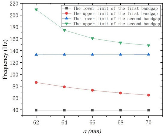 The influence of the spacing of cells on low-frequency band gaps was analyzed. In the simulation experiment, the lattice constant a was increased from 62 mm to 70 mm, and the other structural parameters (b = 25 mm, l = 60 mm, s = 0.35 mm, l1 = 254.8 mm and h = 24.5 mm) remained unchanged. The effect of the lattice constant a on band structure was obtained.