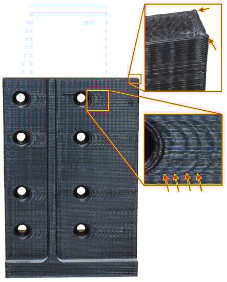 The vibration characteristics of 3D printers and components directly affect the accuracy of the work, as reported in several studies, e.g., [20,21,22]. The main problem in FDM/FFF 3D printing originating from mechanical imperfectness is ghosting (ringing): the emergence of a repetitive pattern on the printed detail surface caused by mechanical vibration of the printer frame. This matter limits the maximal acceleration and speed available to a particular 3D printer [23,24]. Another defect also caused by mechanical imperfectness is corner swell, an outgrowth of the deposed material on a corner [24,25]. An example of these defects is given in Figure 1. They are negligible within a specific range of positioning settings, but printing errors become significant and practically unacceptable when they exceed particular values.