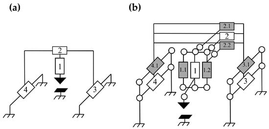 It is not obvious from each kinematic scheme in the left column, which one is better in terms of vibration tolerance unless we consider an additional factor: a finite stiffness of joints between beams, linear guides and other elements of construction. As the simplest approximation, these joints can be considered spherical joints with internal stiffeners. Such a point of view is reflected in Figure 3d–f. From these extended schemes, the advantage of closed kinematic chains becomes obvious: the more spherical joints are involved in possible angular movement the higher the overall stiffness is.