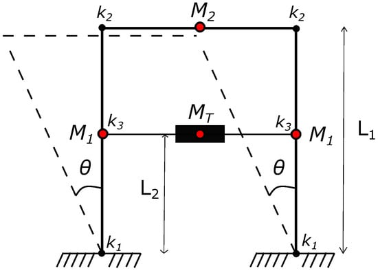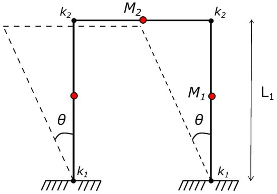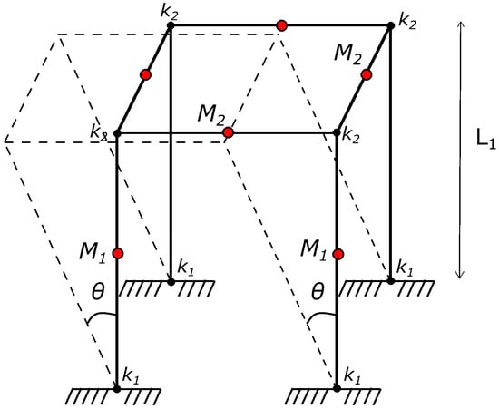Vibration model of a parallelepiped. For simplicity, in the structure shown in Figure 7, the stiffness of the joints can be assumed and equal to and . The length of all vertical beams is equal to .