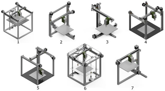 Three-dimensional printers with the designs shown in Table A6 and Table A7 were not found. Probably, such designs are not quite suitable for 3D printing. Moving the printing surface along all three axes can affect print quality since the printbed with the printed detail is much heavier than the printhead. However, it is possible that designs of this type are or will be used for other additive technologies, where complete fixation of the printhead is required due to its size and mass. A recent study published the design of a prototype 3D printer with a fully fixed extruder. However, this printer is not Cartesian and is not commercially available [68].