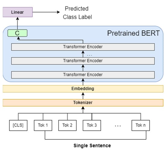 Architecture of fine-tuning with pretrained BERT in single-sentence classification. For classification, only final hidden vector C is used to predict labels and the other vectors are disregarded.