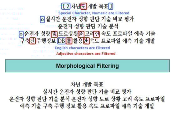 We used the Mecab morphological analyzer [] to perform part-of-speech tagging using text data, where certain stop words such as special characters (“{ },” “( ),” and “[ ]”) were removed. We only extracted nouns from the text data because the dataset primarily comprised text summarized from complete research proposals, and extracting nouns in Korean is a widely accepted method since Korean is an agglutinative language, which is the form of various morphemes attached to the original nouns [,,]. An example of preprocessing performed using the morphological analyzer is shown in Figure 2.