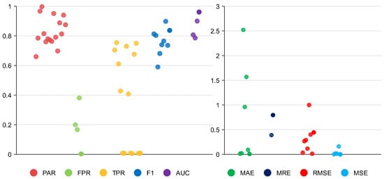 | MAE | MRE | RMSE | MSE | PAR % | FPR % | TPR % | F1 | Train. % | Valid. % | Test. % | |||