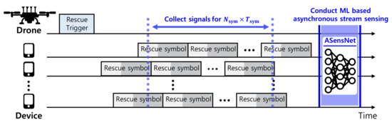 Figure 4 presents our simple survivor discovery protocol. To identify the number of mobile devices around itself, the rescue UAV broadcasts a trigger message. When mobile devices receive the message, they immediately begin to transmit rescue symbols. The UAV then collects rescue signals for N sym · T sym , where T sym is the duration of time of an OFDM symbol. The transmitted rescue signals sent simultaneously by mobile devices are superposed at the receiver. The rescue UAV executes our proposed asynchronous stream-sensing scheme on the received signal to determine how many mobile devices transmitted their rescue signals.