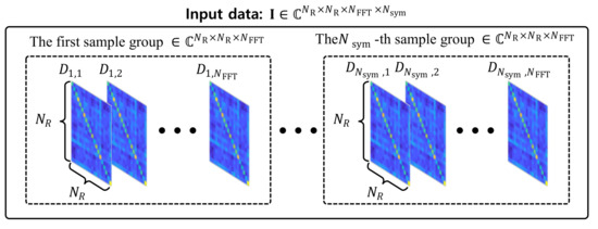 where ( · ) T is the transpose operation, and y r , i ( s ) is the s-th element of y r , i , which corresponds to a frequency-domain sample transmitted via the s-th subcarrier among N FFT subcarriers. Hence, d i , s is a vector that includes frequency domain samples transmitted via the s-th subcarrier in the i-th sample group for all rescue UAV’s antennas. By using d i , s , we calculate a covariance matrix D i , s C N R × N R = d i , s · ( d i , s ) H where ( · ) H is Hermitian transpose. Finally, an input I C N R × N R × N FFT × N sym is constructed as in Figure 5.
