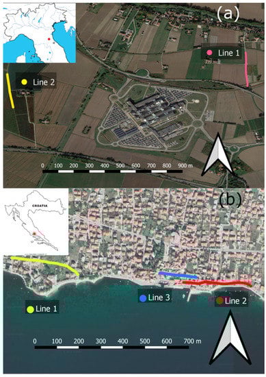 (a) Location of the lines acquired in the area of Ferrara, Italy. (b) Location of the lines acquired in Kaštela, Croatia. Images created on Google Earth Pro on 30 March 2022.