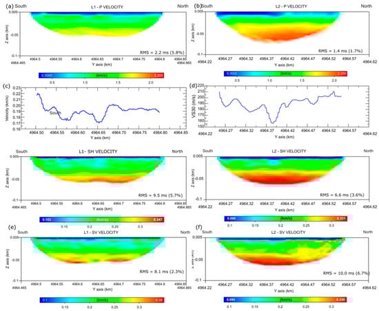 Velocity profiles from the Italian site; in the bottom-right corner, the value of the mean RMS error is shown. (a) Line 1 P-waves, (b) Line 2 P-waves, (c) Line 1 SH-waves with VS30, (d) Line 2 SH-waves with VS30, (e) Line 1 SV-waves, (f) Line 2 SV-waves.