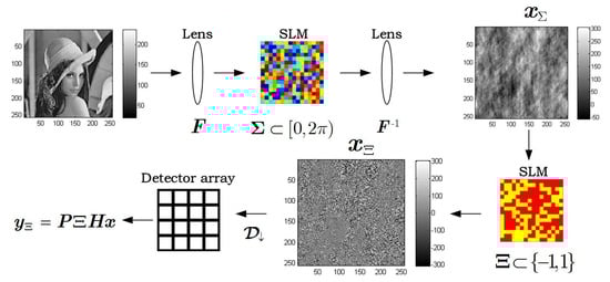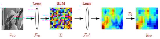 In Refs. [15,16], we proposed a novel compressed imaging using single random phase modulation in the Fourier domain. The optical setup of our proposed is depicted in Figure 6. As depicted in Figure 6, the system is based upon the architecture based on a 4-f optical setup. A phase mask that may be manipulated by an SLM placed in the frequency domain plays a crucial role in maintaining the amplitude of the Fourier transform of the original image unchanged; only the phase of the Fourier transforms of the image makes the type uniformly random delay point-wise. Such modulation can reduce the sampling burden in a spatial domain because the entire information is spread out in the spatial domain.