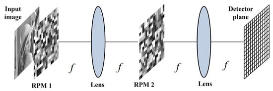 In 2010, Rivenson et al. [15] proposed a single-exposure compressed imaging system by combining the well-known optical scheme of double random phase encoding (DRPE), which could be applied to overcome the resolution limit caused by both diffraction and geometrical limitation. The schematic of compressed imaging using double random phase encoding (CI-DRPE) is depicted in Figure 8. As shown in Figure 8, the image is randomly modulated with the two random phase masks (RPMs) placed in the input plane and the Fourier plane of the 4-f optical system.
