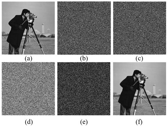 Numerical experiments of CI-DRPE. Numerical experiments of CI-DRPE. (a) Input Cameraman image. (b) RPM1. (c) RPM2. (d) The amplitude of measurements . (e) The phase of measurements . (f) Reconstructed image using CS-DRPE method.