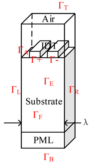 At first, stationary analysis is adopted to extract the C, which employs the FEM/PML model in this paper. Figure 2 shows a single wavelength primitive cell of the infinitely periodic IDTs on the piezoelectric substrate. A perfectly matched layer (PML) is placed at the bottom of the substrate to avoid reflections from the bottom [20]. An air layer is taken into account due to the charge on the IDT-air interfaces [21]. The solid mechanical field and electrostatic field of COMSOL are coupled. The detailed boundary conditions are listed in Table 1. The stationary analysis is performed with a voltage drop ΔV loaded between the left and right electrode. When the analysis is done, the normalized static capacitance Cn can be deduced from the electrostatic field energy We, namely: