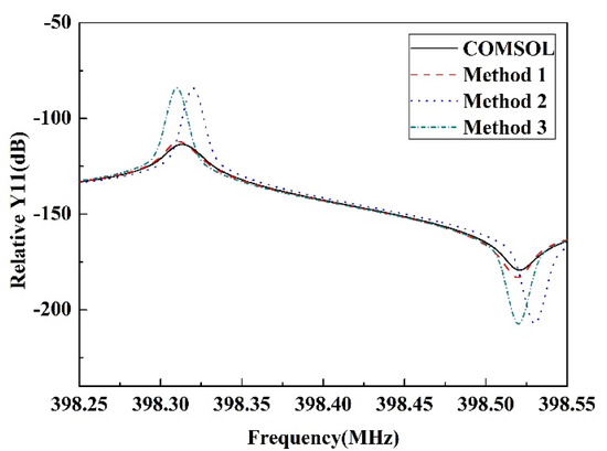 After the calculation, three groups of COM parameters were obtained. Then, we calculated the relative admittances (Y11) by these COM parameters and COMSOL, respectively. As depicted in Figure 3, the Y11 calculated by the first group of COM parameters, extracted by the method 1, is in the closest correspondence to the COMSOL calculating Y11. The slight difference is caused by the PML, which introduces additional attenuation in the calculation [25]. Thus, it could be concluded that our proposed extraction method holds excellent characteristics of higher accuracy and more efficiency simultaneously.